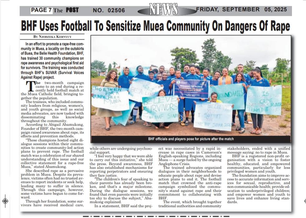 In an effort to promote a rape-free community in Muea, a locality on the outskirts of Buea, the Belie Health Foundation (BHF) has trained 30 community champions on rape awareness and psychological first aid for survivors. The training was conducted through BHF’s SUVAR project (Survival Voices Against Rape).